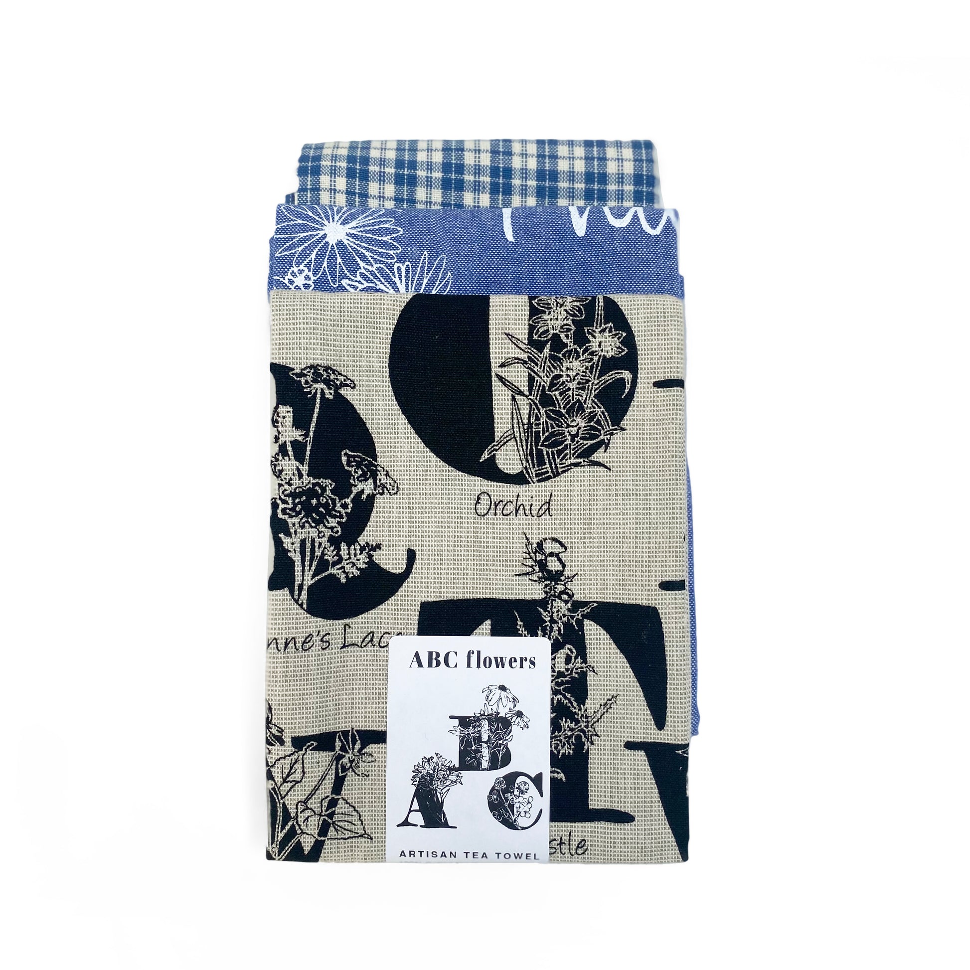 Botanical Set Artisan Tea Towels + Abc flowers + Thankful + Blue Checked Towel