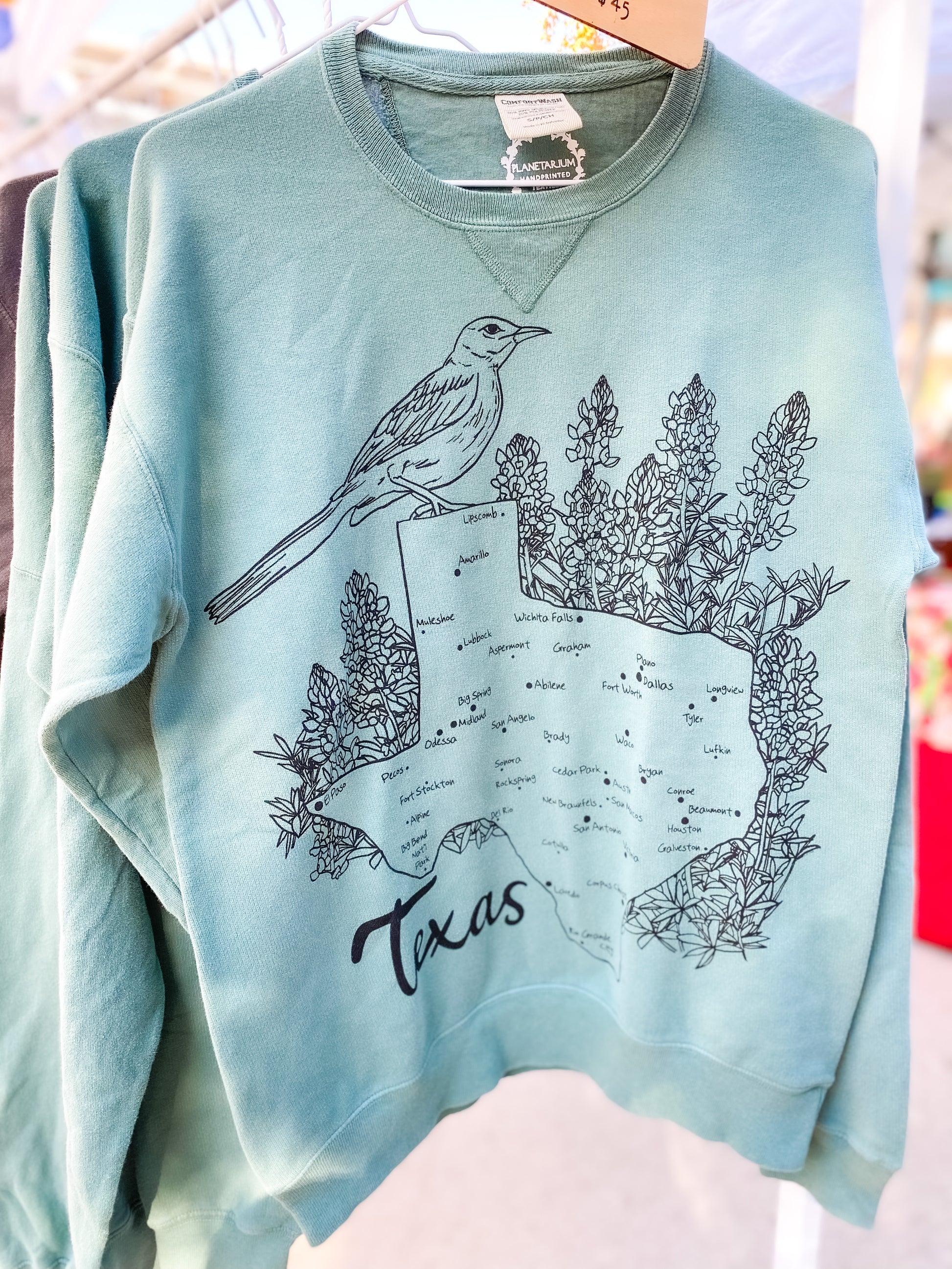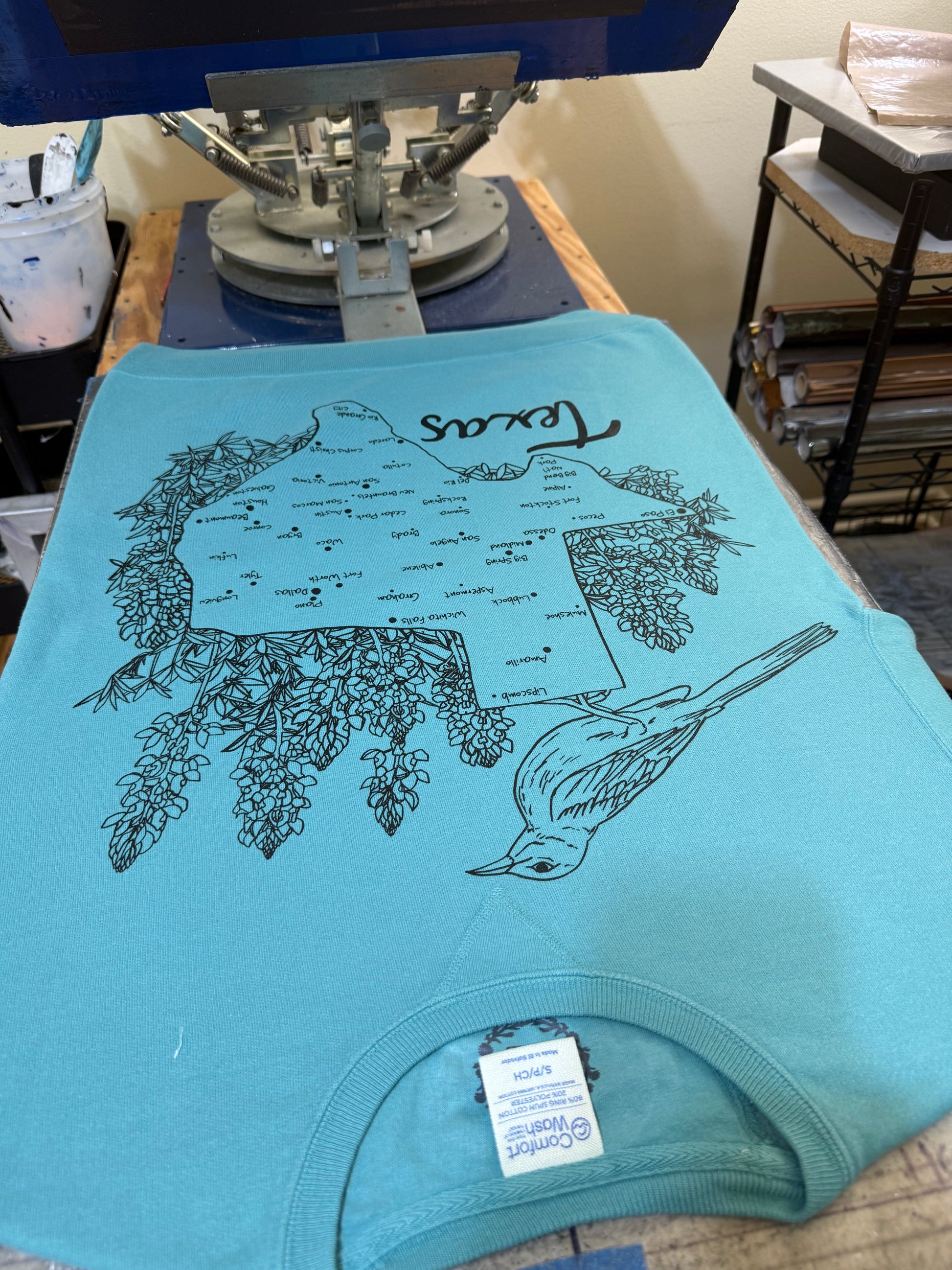 Show off your state pride with our Texas Sweatshirt! Featuring beautiful bluebonnets and the iconic northern mockingbird, this sweatshirt is perfect for any Texan. Made with quality material, it's comfortable and stylish. A must-have for any Texas enthusiast. Original Botanical art work - pattern screen printed in black ink.