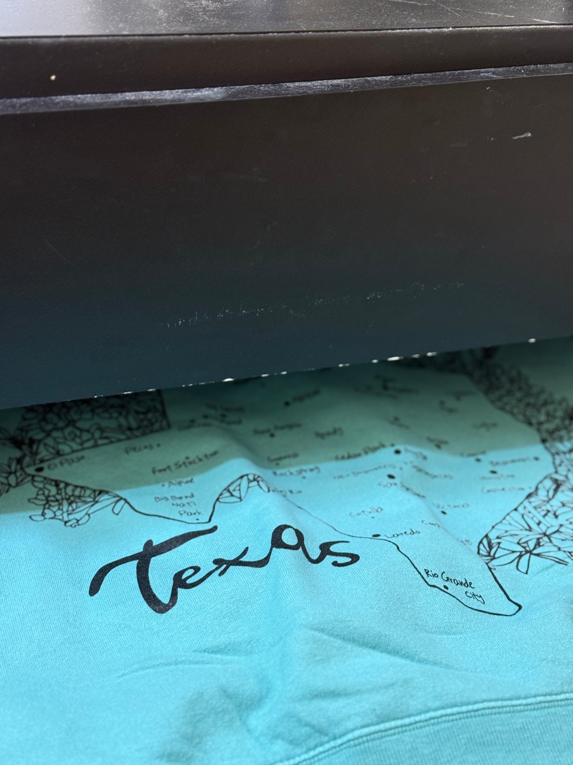 Sweatshirts are handprinted with our original are Texas wildflowers pattern.