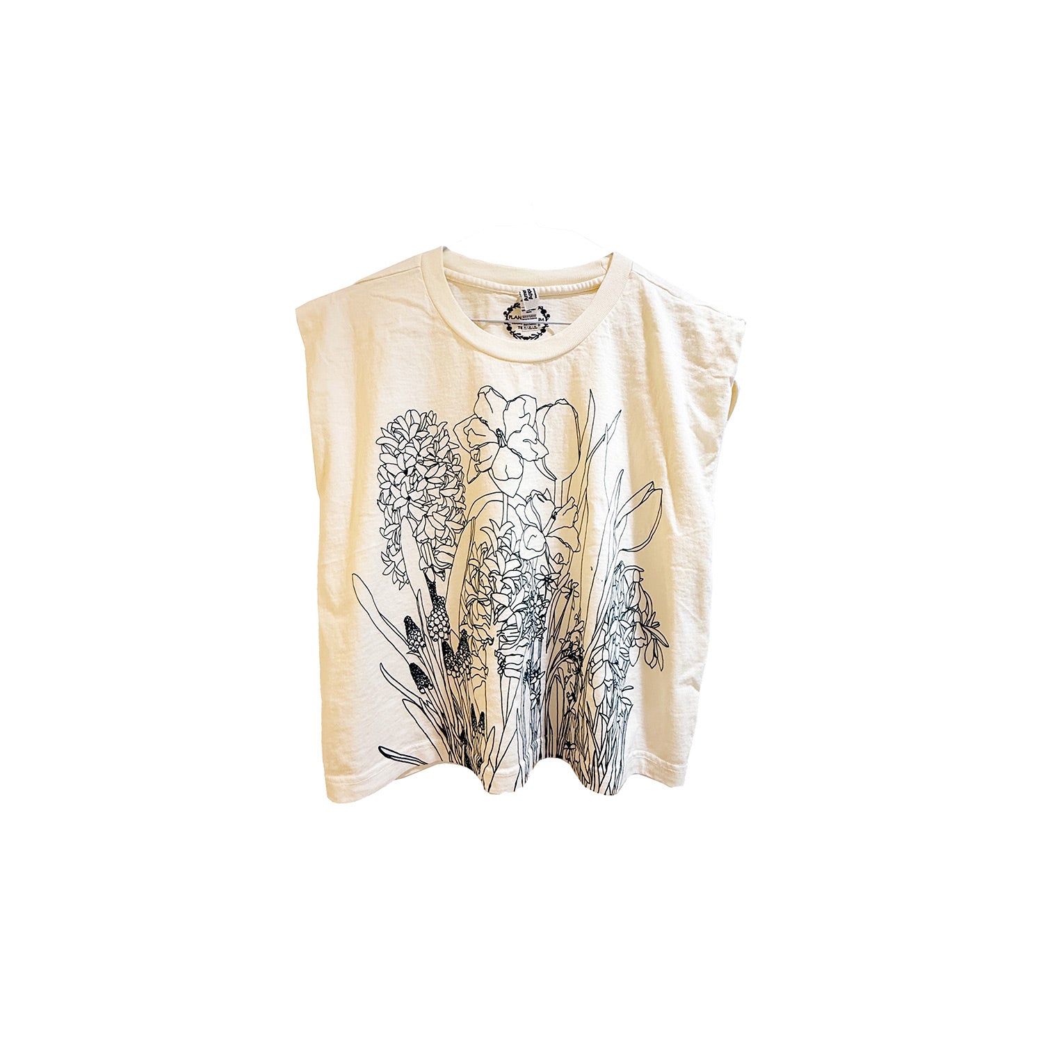 Discover the Handprinted Botanical Muscle Crop Top, a perfect blend of sustainable fashion and artisanal craftsmanship. Featuring an original botanical pattern, each crop top is screen-printed by hand with eco-friendly, soft-touch water-based ink for a vibrant, breathable design. Made from 100% US-grown sustainable cotton, this garment-dyed t-shirt offers a vintage, faded aesthetic with a boxy, slightly cropped fit and structured shoulders for a trendy, edgy look. Designed for comfort, it includes taped neck and shoulders, side seams, and a recycled tear-away label. Ethically produced in our studio, this handprinted crop top is a must-have for your summer wardrobe, ideal for eco-conscious style icons seeking unique botanical fashion. Elevate your summer outfits with this sustainable, handcrafted piece.